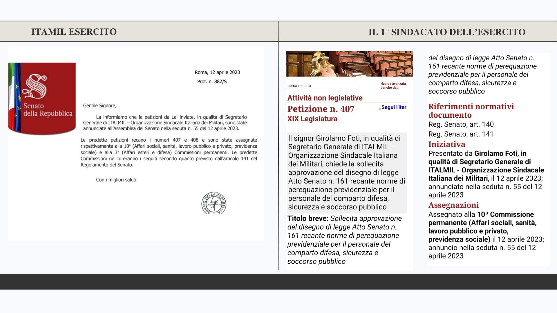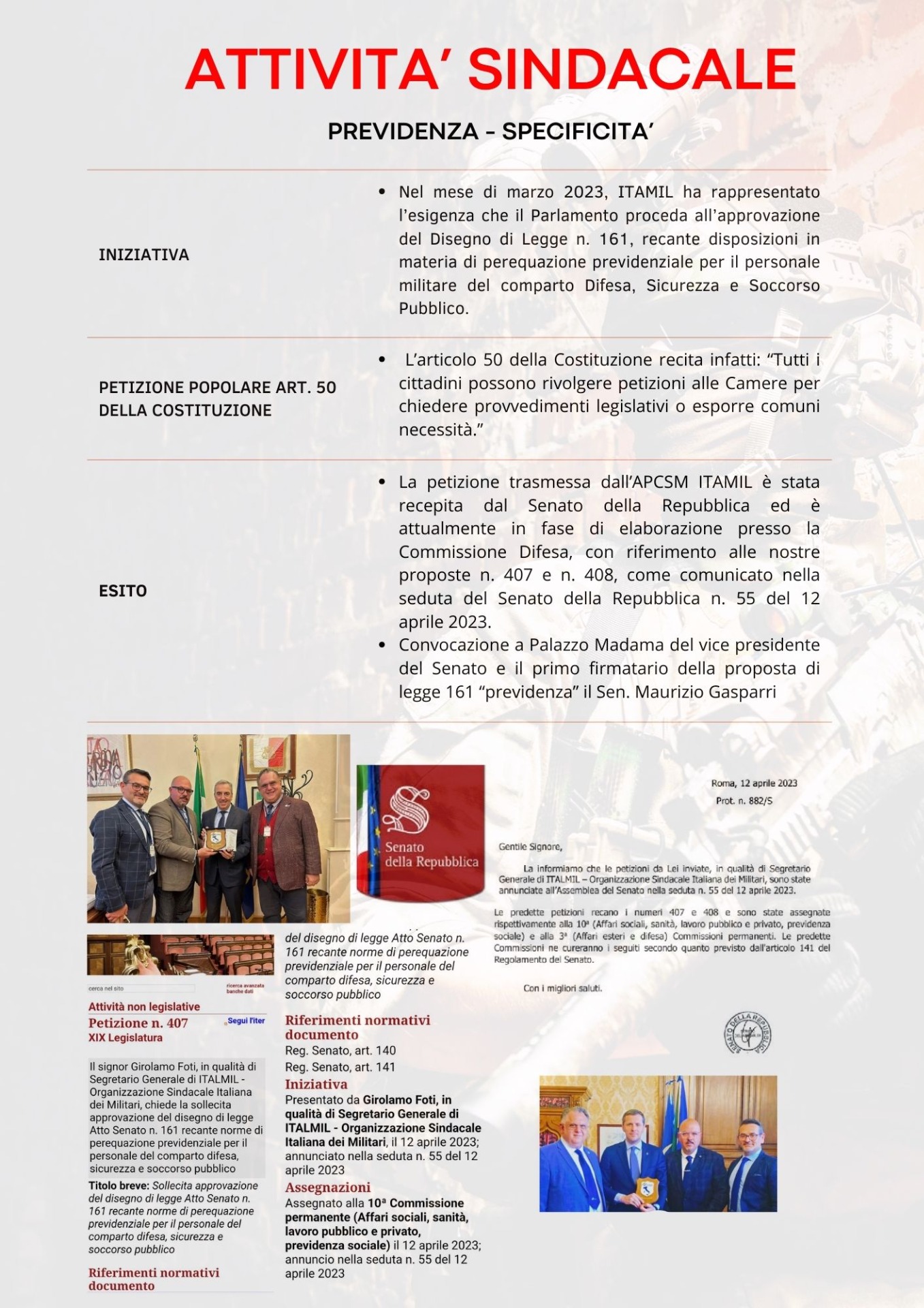 Richiesta di approvazione del ddl atto senato 161 in materia di perequazione previdenziale per i militari.
