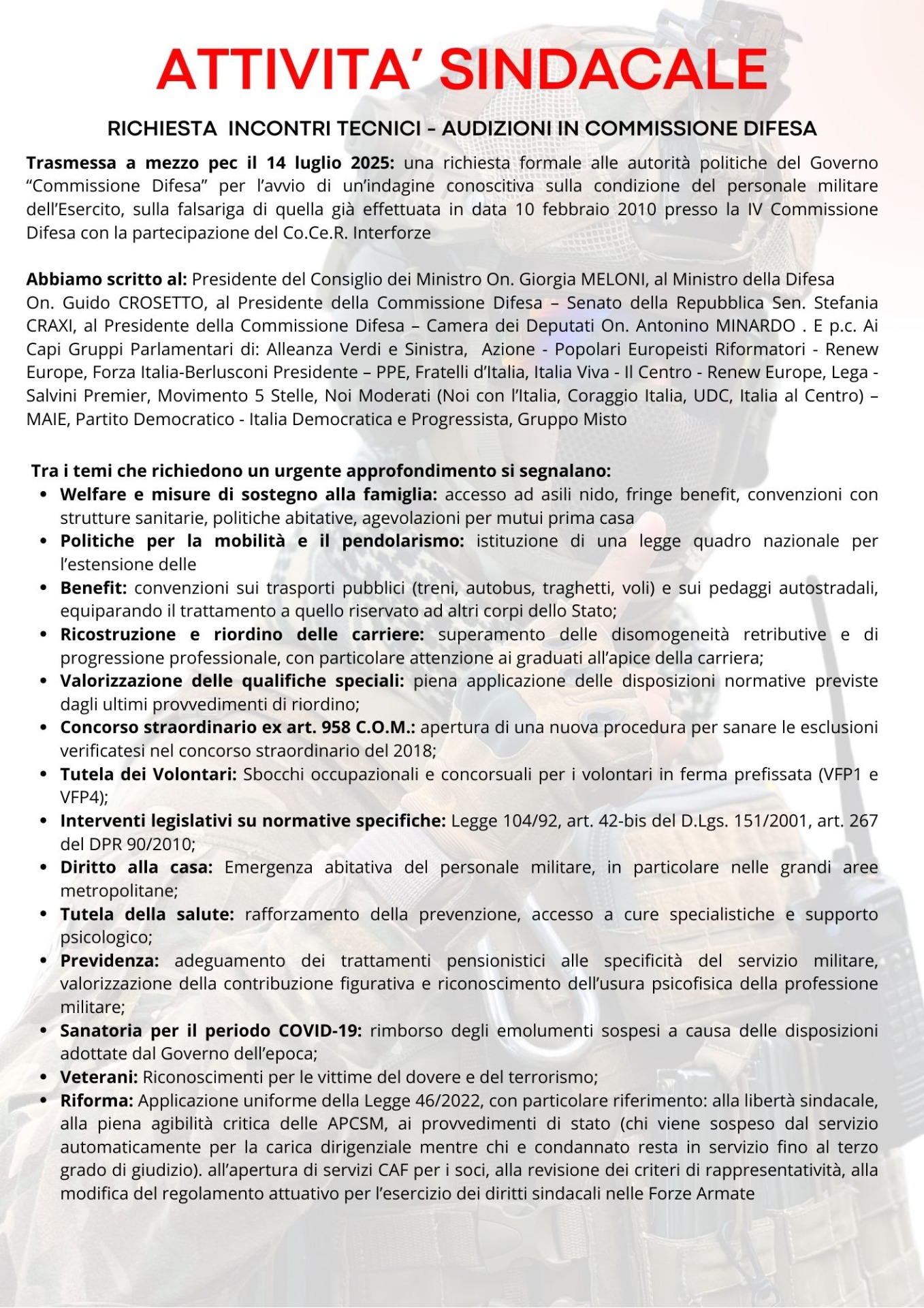 Ecco cosa hanno chiesto al Ministro della Difesa tra i vari punti (era proprio necessario?): Chiara definizione delle prerogative attestate al "dirigente sindacale", rispetto agli incarichi elettivi stabiliti dai singoli Statuti, alla durata dei mandati, all'incompatibilità con chi "esercita le funzioni di Comandante di corpo", alla posizione di stato giuridico, avanzamento, impiego(nazionale/internazionale) e trattamento economico e previdenziale(anche quello eventualmente a carico delle OO.SS.) del predetto personale, fruitore di distacco e/o permesso sindacale;