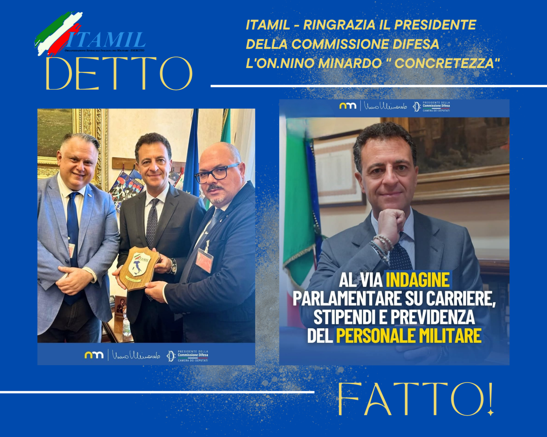Palermo, 28 ottobre 2025 – Il sindacato Itamil Esercito ha inviato alla Commissione Difesa della Camera dei Deputati, presieduta dall'Onorevole Nino Minardo, una memoria contenente proposte normative per migliorare il benessere, la mobilità e la valorizzazione professionale del personale militare.Il Segretario Generale Girolamo Foti e il Presidente...