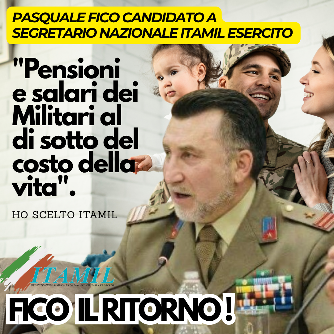 Roma, 15 ottobre 2025 — Il Segretario Generale di ITAMIL, Girolamo Foti, ha ufficialmente indicato il Primo Luogotenente Pasquale Fico come candidato alla carica di Segretario Nazionale ITAMIL, conferendogli nel caso venga eletto la delega ai rapporti con le Istituzioni della Difesa e dell'Esercito.